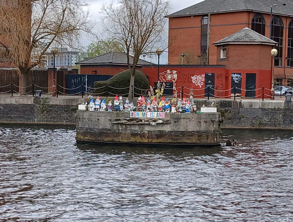 We walked along the ship canal, passing “Gnome Island”, which has been a home to Gnorman the gnome from 2017. Since then he has been joined by many of his gnome family and friends, including his wife, Gnorma. After wishing the gnome family well, we continued our walk up to Salford Quays and crossed the bridge into the Lowry Centre, where we enjoyed our lunch at the Harvester restaurant. I wonder what the gnomes had for their lunch. Perhaps they had the short ribs followed by strawberry short cake.